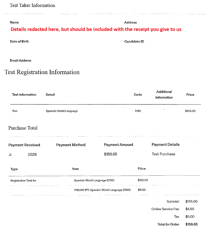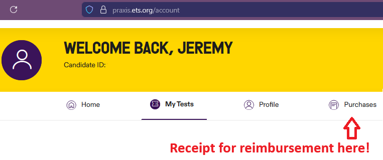 ETS World Language Exams for senior testing are reimbursable. Login to your account at praxis.ets.org, and find the purchases link. The Praxis website was recently overhauled, but your receipt should look similar to the image below. We need the detailed receipt showing your name, what you paid for, and any payment details. The Business Office will reject admission tickets – they require the detailed purchase receipt.